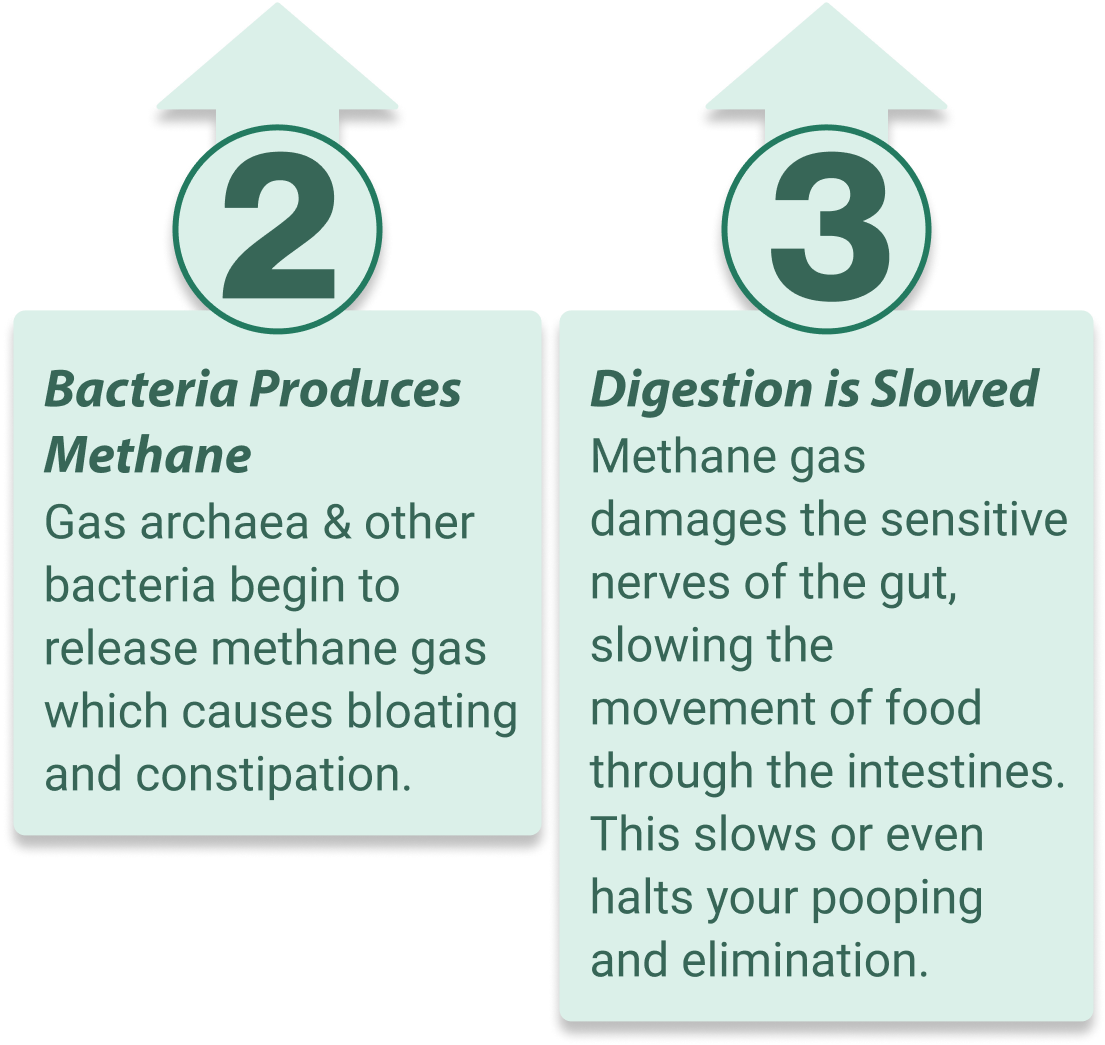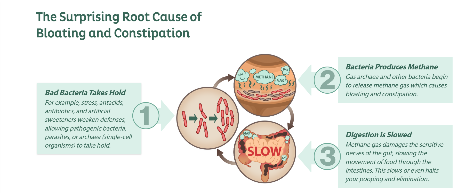 You see, uncomfortable bloating and constipation primarily come from archaea colonizing the small intestine and producing high levels of methane gas.