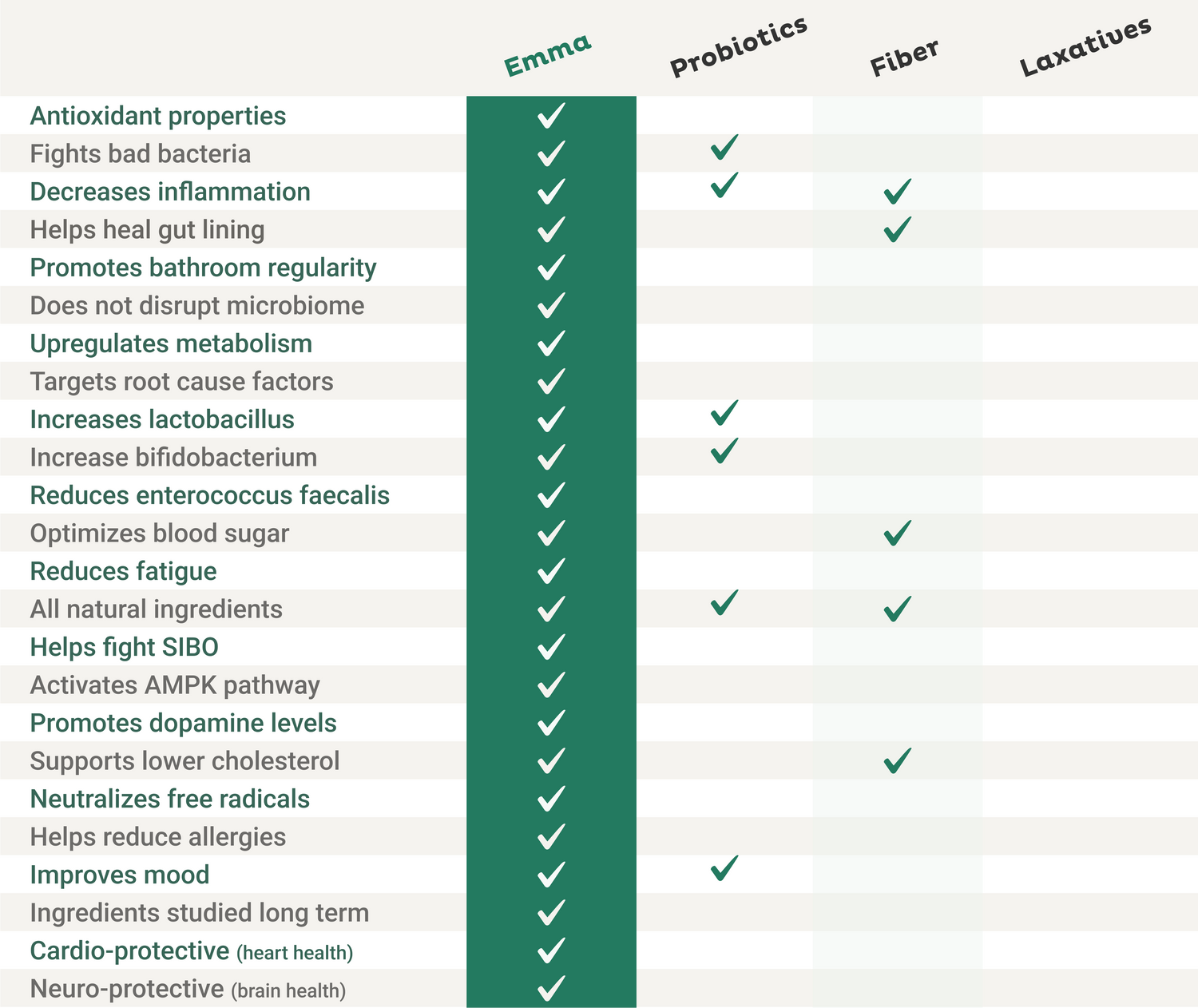 Emma stops the production of methane gas at the source. It works in 3 different ways to normalize bathroom habits, usually within a few weeks of taking it to eliminate constipation and bring back those perfect poops, daily.