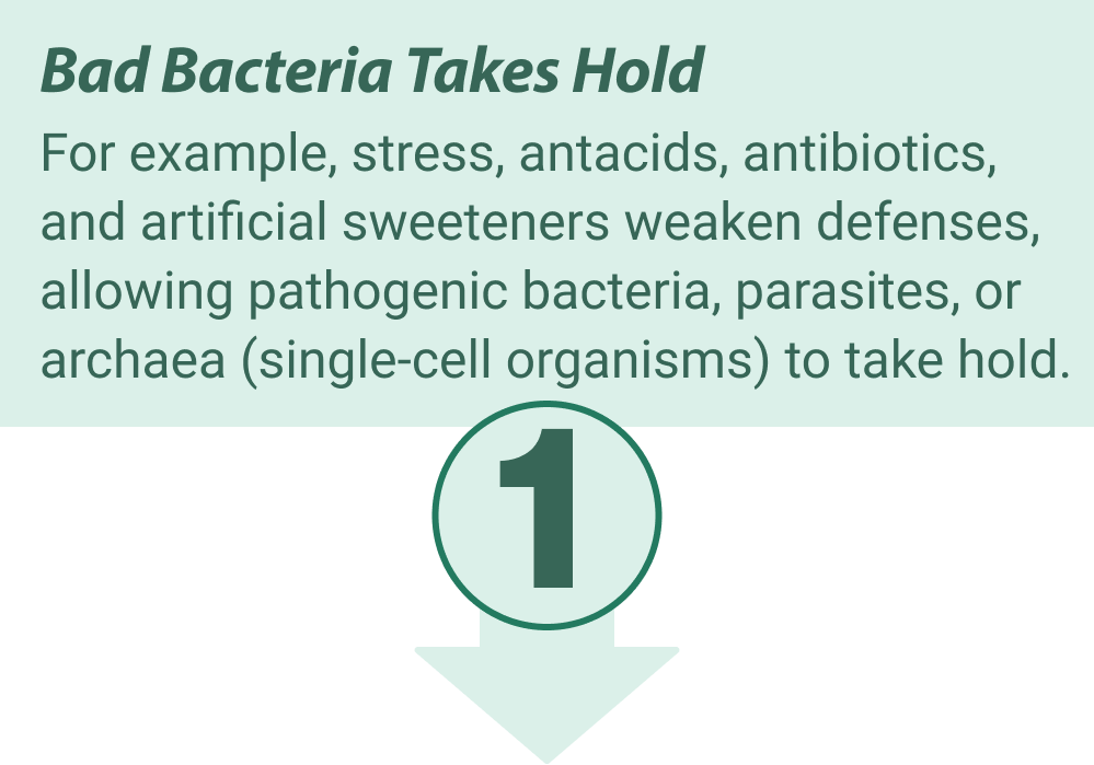 And the good bacteria that do survive only make it to your small intestine, which is not where they're supposed to be.